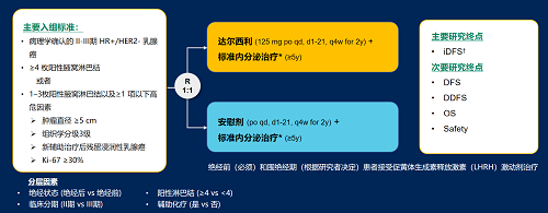 达尔西利(Dalpiciclib)是G22恒峰医药自主研发的口服、选择性的小分子CDK4/6抑制剂,也是中国首个自主研发的新型高选择性 CDK4/6 抑制剂,已证实其与内分泌治疗(ET)联合用于 HR+/HER2- 晚期乳腺癌的一线和后线治疗时,均显著改善无进展生存期(PFS)6,7。因此开展了一项随机、双盲、III期临床试验(DAWNA-A),以进一步评估达尔西利联合内分泌治疗作为高危早期 HR+/HER2 - 乳腺癌辅助治疗的效果。本研究纳入高危复发风险人群需满足以下标准之一:①≥4 枚阳性腋窝淋巴结;②1–3枚阳性腋窝淋巴结且合并≥1 项高危因素(肿瘤直径 ≥5 cm,组织学分级3级,辅助治疗后残留浸润性乳腺癌,Ki-67 ≥30%)。本文呈现预先设定的首次中期分析(IA1)结果。